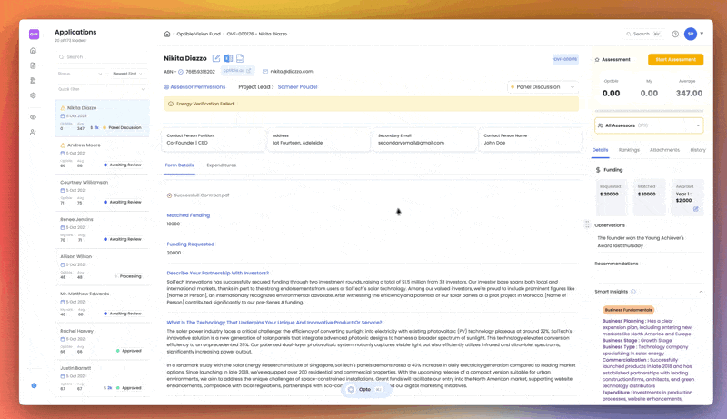The All Assessors section shows who has assessed each application and how much they've contributed. A Details tab includes funding information, smart insights, observations, and recommendations.